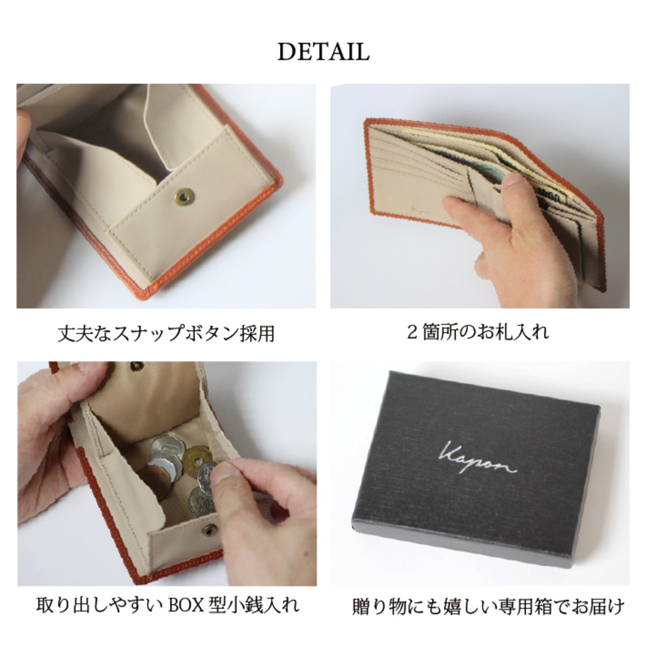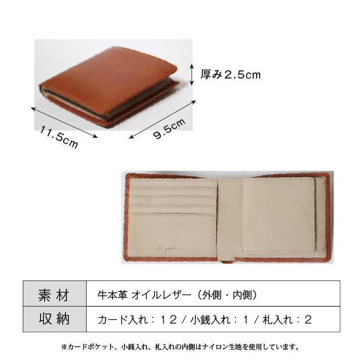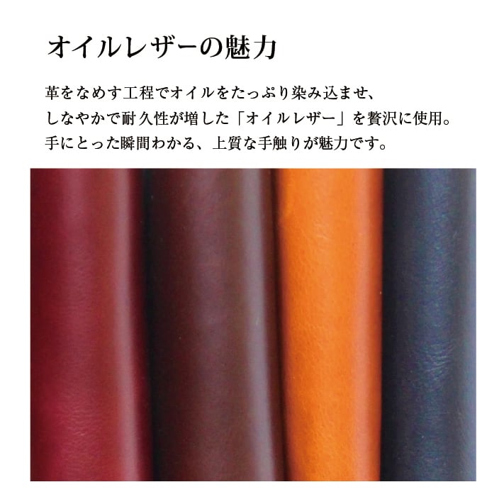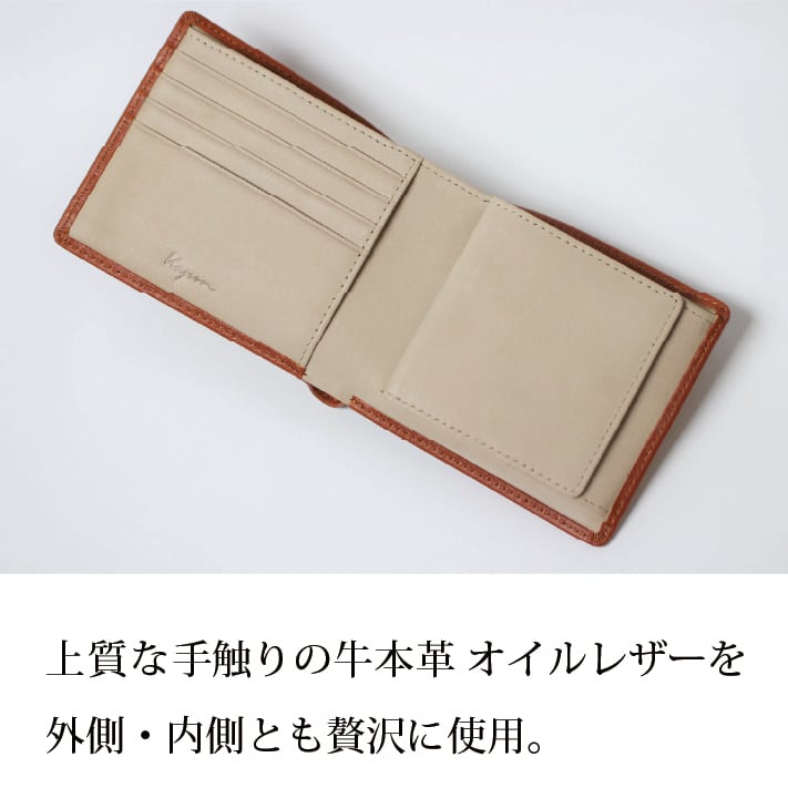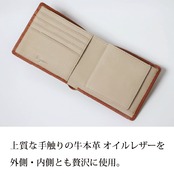オーソドックスな二つ折り形状で、外側・内側ともに牛本革 オイルレザーを使用しており、上質な手触りが特徴の財布です。