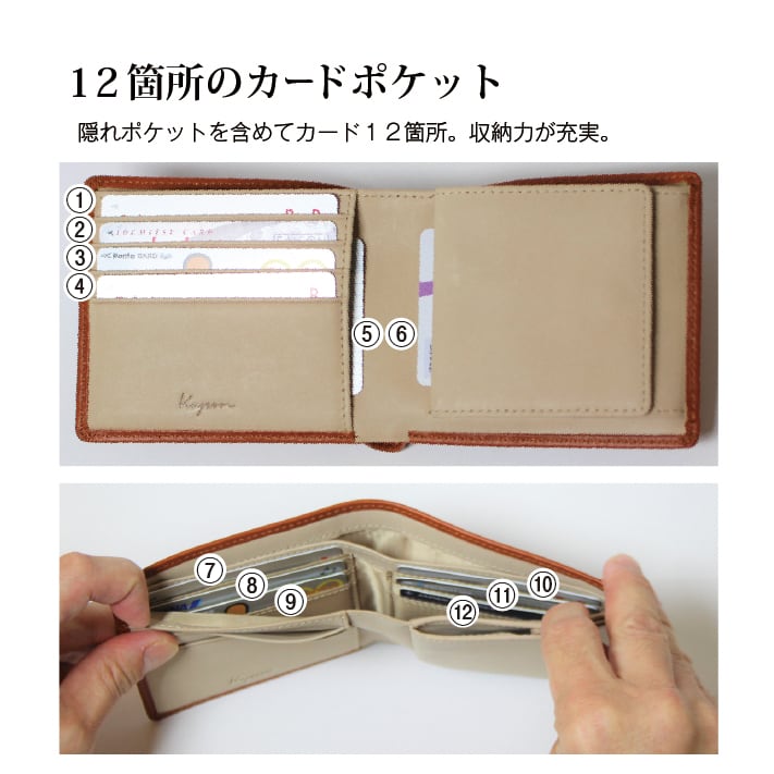 ポケットの出し入れがしやすいコンパクトなサイズながらカード12枚、紙幣15枚、小銭25枚程度収納可能な二つ折り財布です。